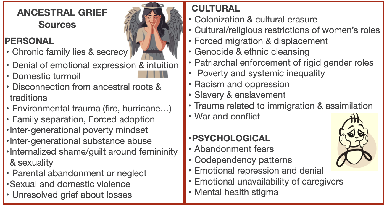 Ancestral grief is about the emotional, psychological & biological wounds passed down through generations from the traumatic experiences of your ancestors. When they faced repeated abuse, addiction, chronic illness, or other hardships, their survival instincts led to developing behaviors, beliefs, & coping mechanisms in behaviors & beliefs that helped them endure harsh, unsupported environments.