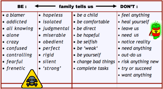 We absorbed these Toxic Rules from family, school, our community, religion…. They are the underlying beliefs the WIC is absolutely convinced are the absolute ‘truth’ which we are obligated to obey – on pain of death (abandonment)- even if we disagree or hate them. Notice the contradiction & conflict. No wonder we say we’re confused!