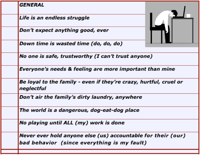 RULES: No matter what our family environment looked like, all ACoAs have gathered a litany of TOXIC RULES, which we follow ‘religiously’, even well into Recovery – but hopefully less so with growth!