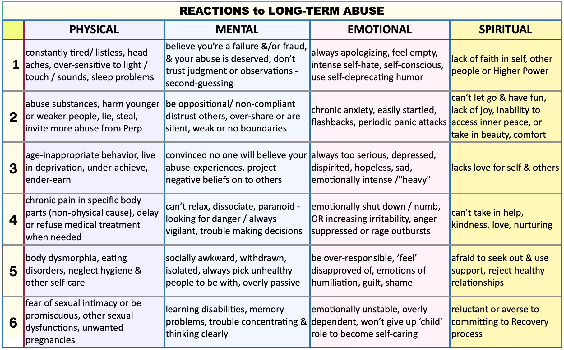 Even so, anyone growing up in an unhealthy family will have experienced A/A in all 4 categories (PMES), most often mental & emotional – each in varying degrees of intensity.