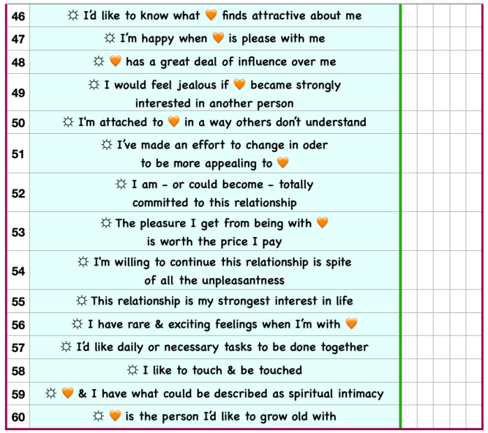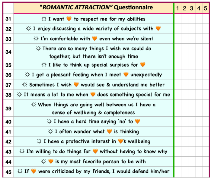Add up each column (1-5) – for both Parts 1 & 2. Combine all columns , to get one number for your Romantic Attraction (R.A.)
