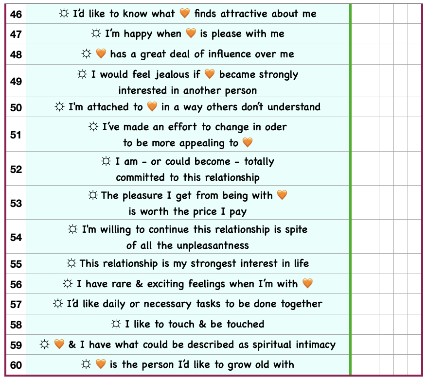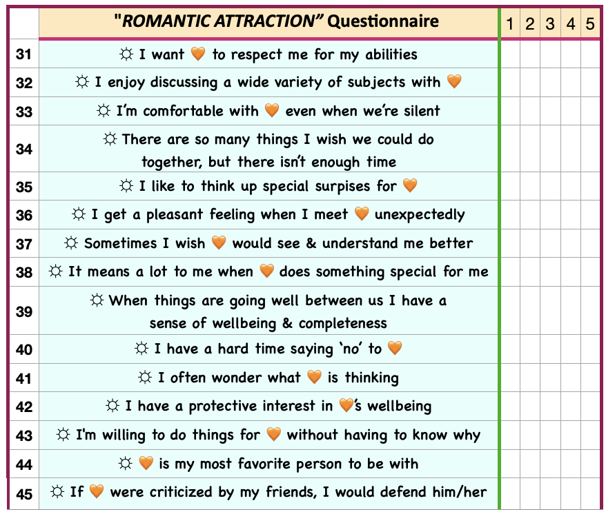 Add up each column (1-5) – for both Parts 1 & 2. Combine all columns , to get one number for your Romantic Attraction (R.A.)
