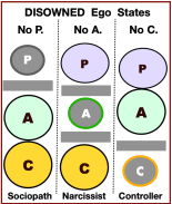 c. Missing Inner ADULT: When A. is unavailable completely, there’s no ‘reality’ guide. It’s the most disabling of the 4 types of exclusion, so the person will be confused, disoriented, switching between Parent & Child ego states. At it’s extreme they may be narcissistic &/or paranoid, acting in bizarre ways, obsessed with the past or focused the future. Possibly diagnosed as bi-polar or psychotic.
