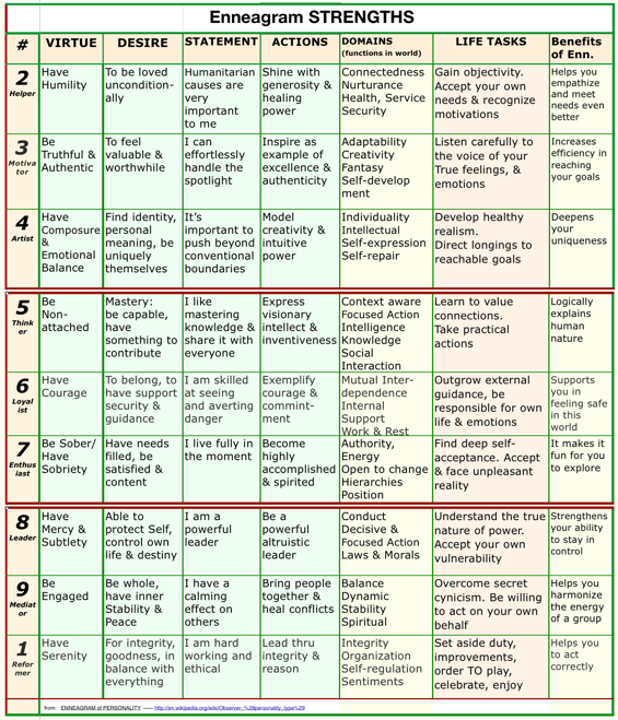 ● The combination of the 9 Types make up a total Microcosm of the human viewpoint. The movement toward Presence (the ‘work’ is to become awake to a Higher Truth) starts at the Mechanical / Automatic way of functioning on the right side – thru #1-the way of the body, #2-the way of love & #4-the way of power, which need to be learned before moving up the left side. Growth proceeds around the Inner Points via the ‘spiritual’ octave Do-Re-Mi-Fa-Sol-La-Ti-Do, toward full Essence /Consciousness (#9), as taught by Gurdjieff.