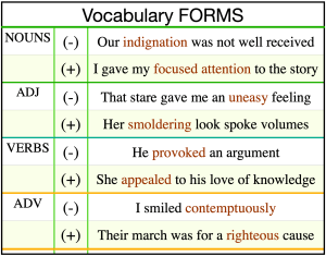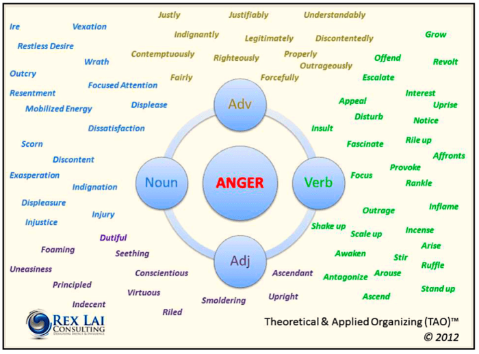 This chart shows the many ways anger can be expressed, depending on the grammatical form being used. Not all the terms are ‘negative’ but are all related, for-or-against, falling into, or rising above.