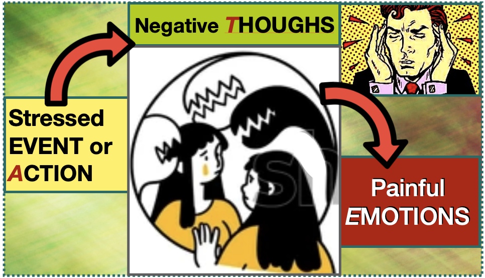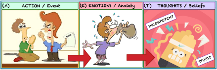 What generates our reactions to an external upsetting event (A) is our Thinking, which causes Emotions, which may or may not lead to your Actions in response.