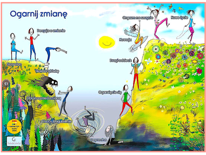 Translation, from top left to top right: Embrace Change – old state, decision to change, jump head first, chaos & confusion, defense against change, depression, I embrace it, second breath, new me, joy at the top, new life.