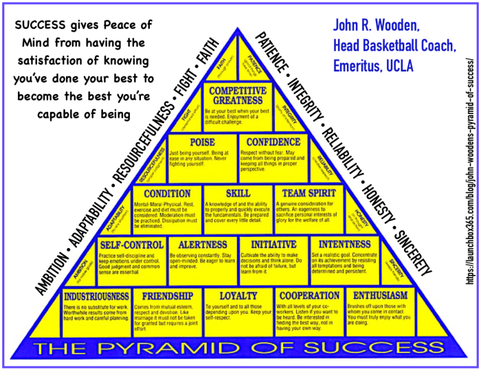 ATHLETICS: Reaching the winners circle in any field requires hard work & perseverance, which includes having many positive qualities. Coach Wooden spent his career fostering greatness. His believed that to fully achieve success someone must first develop the building blocks of determination: