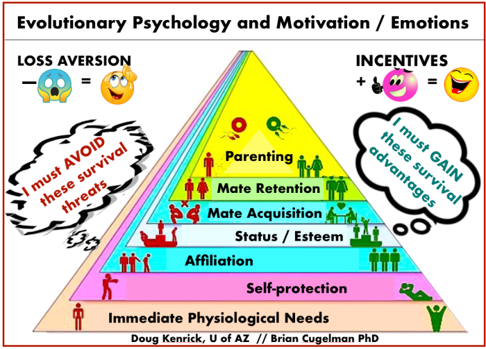 This is because there’s an ongoing interplay between our internal motivations & environmental situations, either by opportunities or threats, determining which needs capture our attention at any point in life. “Cognitive systems (the human mind) are biologically prepared to learn or have evolved a vigilance for stimuli relevant to fundamental goals. Neither the stimuli nor goals exist in isolation – the psychological system has co-evolved with features of the ecology.”