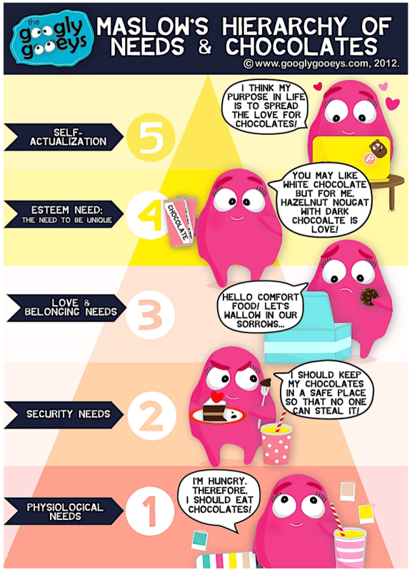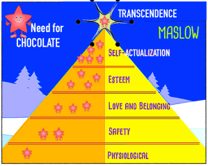 ➡️ Sister Alma Rose: thinks that perhaps the greatest flaw in Maslow’s theory is its failure to account for the importance of chocolate at every level of human experience. She’s taken the liberty of modifying his pyramid to indicate that the more spiritualized one’s existence, the greater one’s need for chocolate!