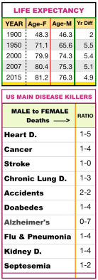 Longevity gap: more than 1/2 of all U.S. women over 65 are widows, by 3-1 = for every 100 women, there are only 77 men. By age 85 they outnumber men 2.6 to 1. Re: health : “WHY do MEN LAG BEHIND?“ 13 FACTORs & remedies