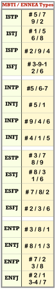 ⬆️ Long chart: ONLY one person’s opinion. EXP: This blog writer is an ENFJ – Ennea 8, but this is considered rare.