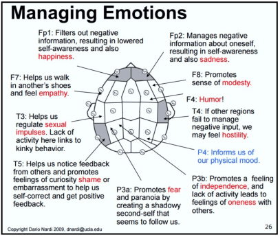 Many regions are involved in emotions as well as thinking, such as region T5 on the lower left, which helps us pay attention to social feedback. It light up when we notice how others are responding to us, such as being criticized, noticing a smile of approval…. or feeling embarrassment, which may spur us to change our behavior. (More….)