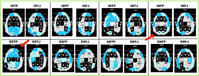 • Every type uses some region in common with their ‘opposite’ type. An ISFP (Fi-Se) relies on some of the same regions as INTJs (Ni-Te) or ENTJs (Te-Ni)…