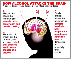 ✴︎ 30 seconds after the first sip, alcohol rushes into the brain, slowing down its chemicals & pathways used to send messages. This alters mood, slows reflexes, throws the drinker off balance & they can’t think straight. Alcohol makes it hard to store experiences in long-term memory, so they won’t remember things later …. (More…. )