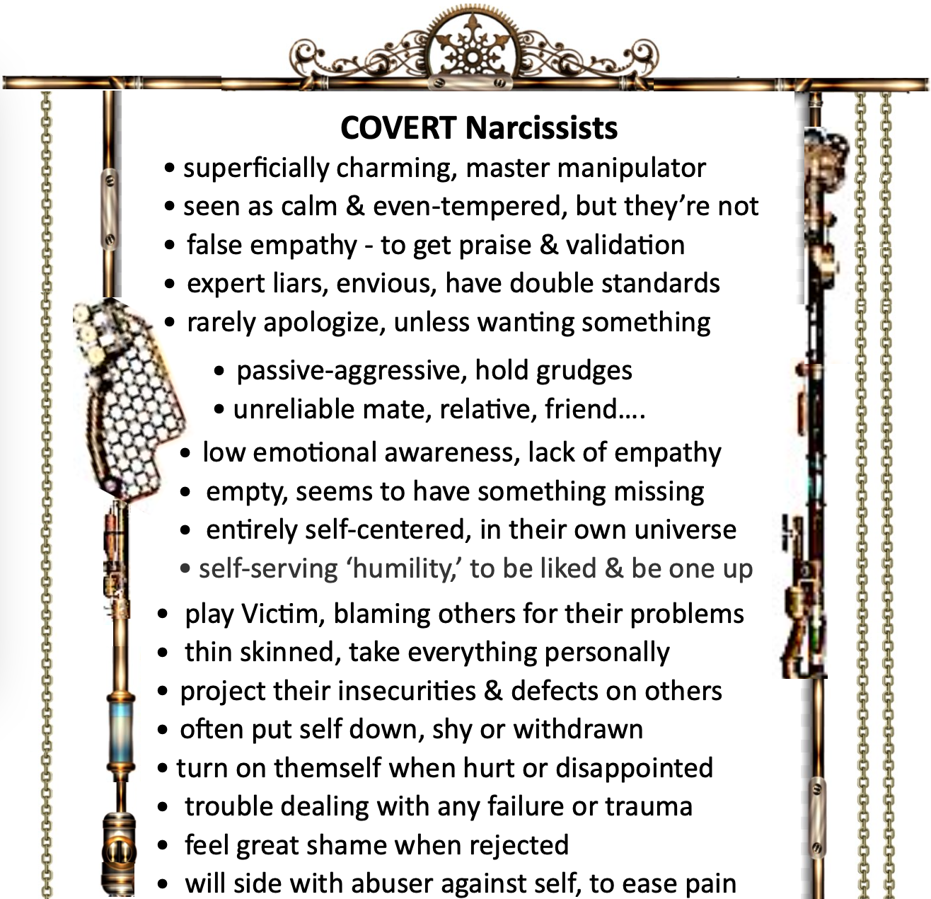 They become totally invested in making sure everyone else accepts & admires the FS, taking great pains to hide the ‘Real’ one. Like Overts, they too are afraid to dig behind their defense walls to liberate the True Self, which is buried deep, along with any true empathy for others.