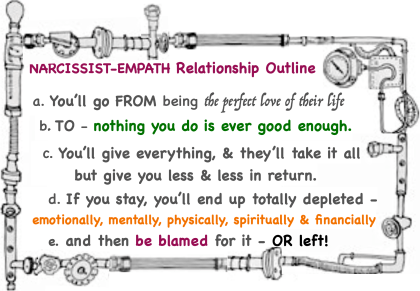 11. Empaths (Em) find it impossible to ‘understand’ the narcissist’s (N) abusive behavior. In trying to making sense of it, the Em blames themself for everything that’s wrong in the relationship, since the N has convinced the Em they’re not good enough and not worthy of love – from anyone.