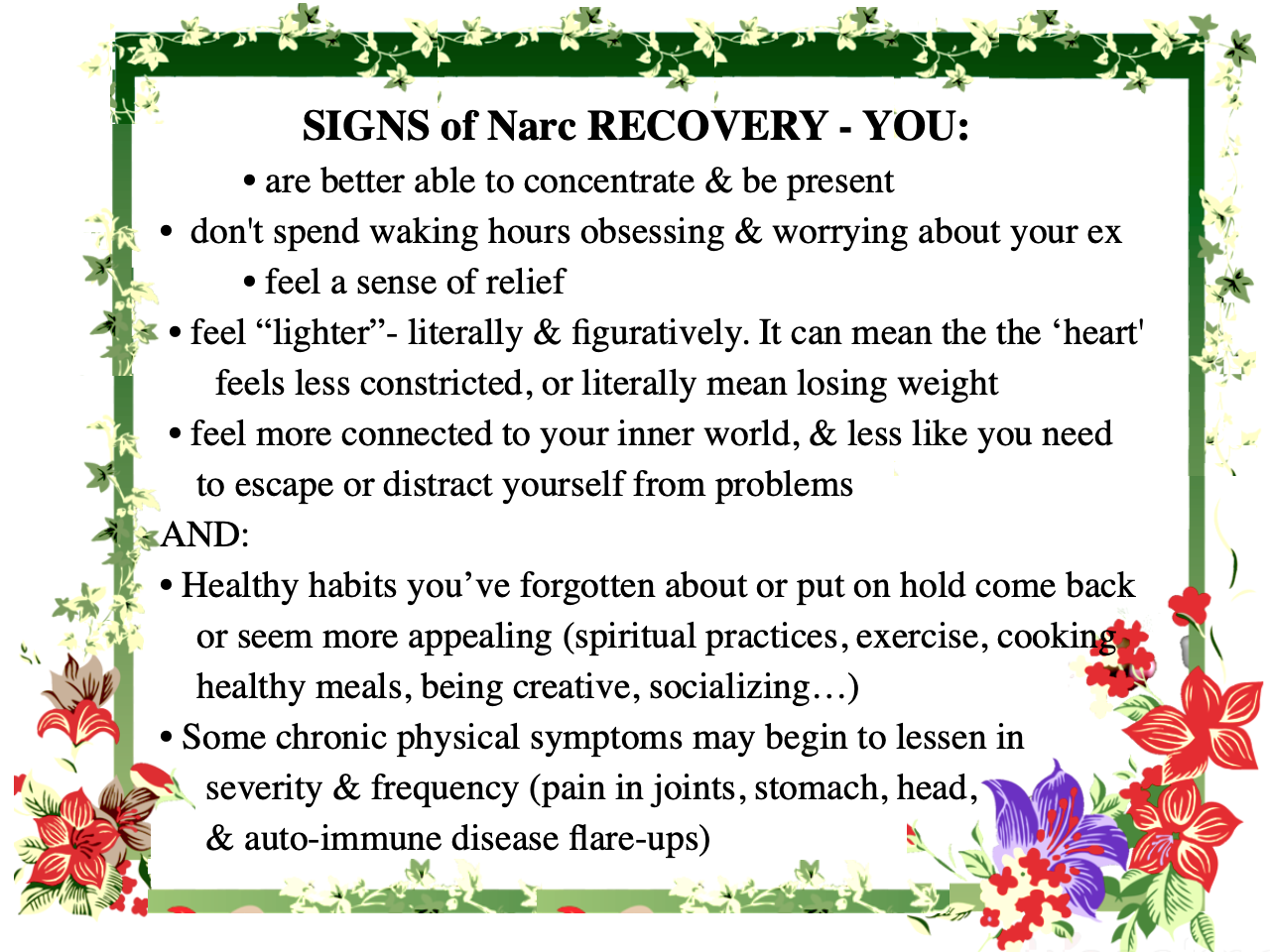 Recovery looks different for everyone. It may take weeks of no-contact for you to feel relief. For those who need to be in some amount of necessary communication with the main N – your ability to hold boundaries will affect your ability to ‘heal & grow”.