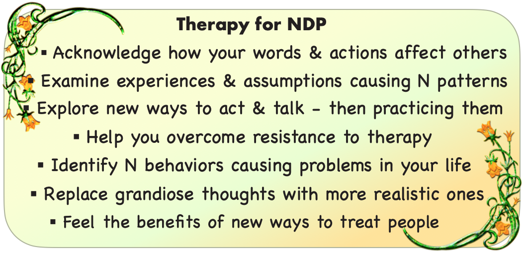 Most NPD clients do not enter therapy in order to reflect or change. They usually come to get relief from unpleasant feelings & symptoms, or to please someone important to them. Most Ns leave as soon as they feel better or the other person is appeased