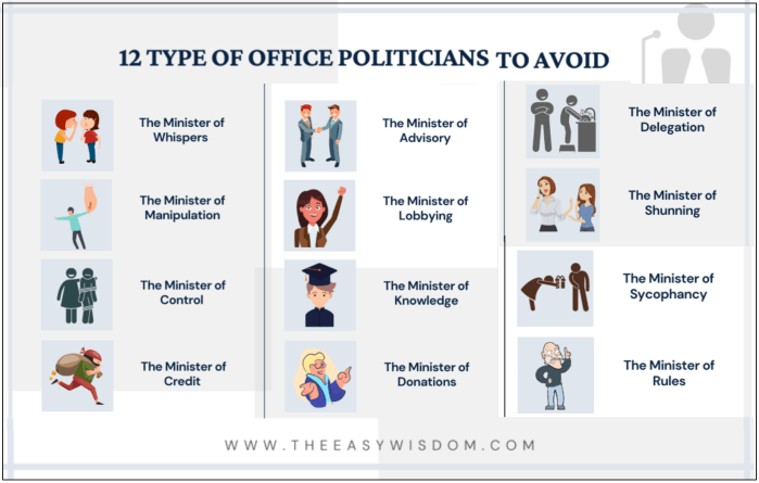 NEGATIVES TYPES – create tension, inhibit employees’ ability to perform well, harming teams & employee morale. Most business with a staff can end up hiring one or more of these office politics personalities. If their skills are crucial to the operation, it will take a clever boss to cope with the harmful ones successfully.