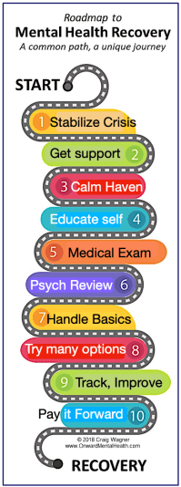 ⬅️ “JOURNEY to RECOVERY, a 10-step process” Although everyone’s journey of mental health recovery is unique, this roadmap works for many…. Recovery takes time, so the bulk of our effort is spent in steps 7-9.