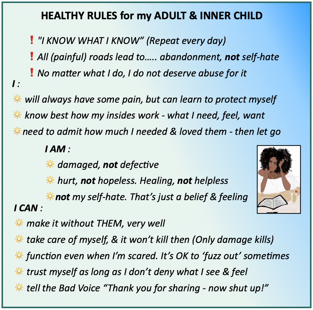 Review : HEALTHY RULES for ACoAs 08/29/202206/25/2022 dmtorbi ACoAs PREVIOUS : Dissociation #6 POSTs : “Toxic Family Rules” “SYNOPSIS: Unhealthy vs Healthy Family RULES” NEXT : Share this: LinkedIn, Reddit, Pinterest Click to share on Facebook (Opens in new window) Facebook Click to email a link to a friend (Opens in new window) Email More Click to share on LinkedIn (Opens in new window) LinkedIn Click to share on X (Opens in new window) X Click to share on Pinterest (Opens in new window) Pinterest Click to share on Reddit (Opens in new window) Reddit Like Loading... Related