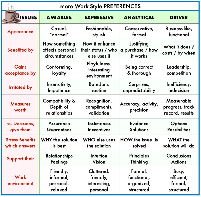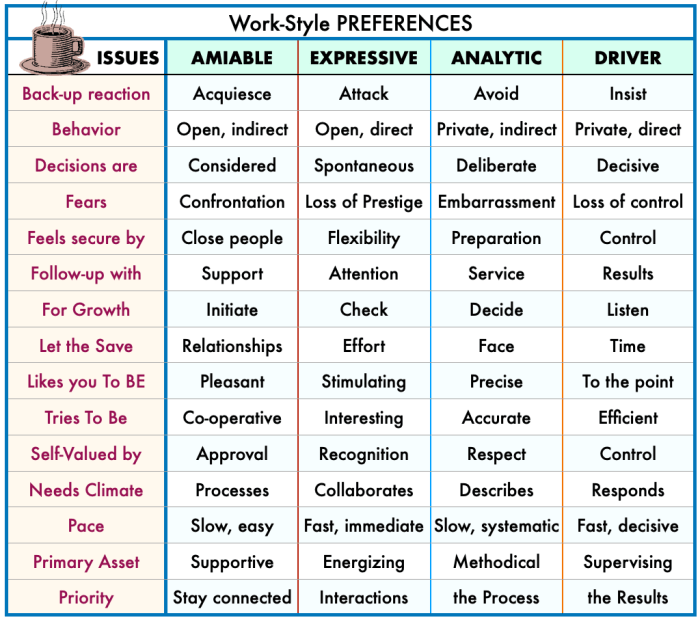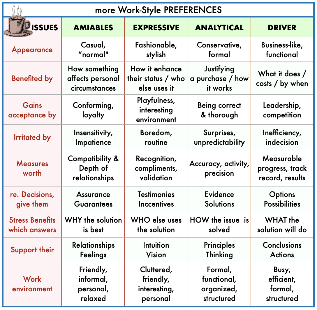 This chart indicates how people with each of the 4 different work styles will likely deal with the ‘issues’ listed.