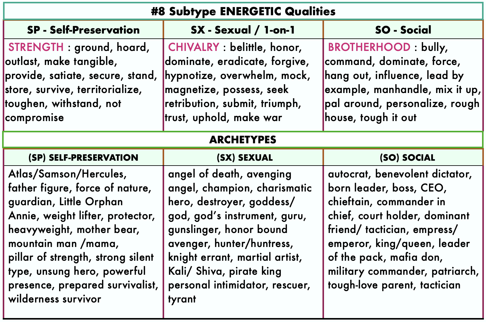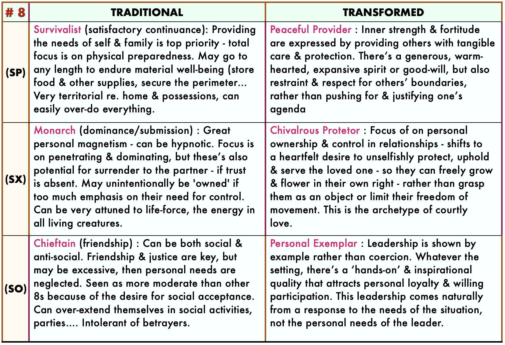 Social 8s express lust & aggression – but mainly in the service of others. A social-antisocial person, the helpful 8 appears less aggressive & more loyal than the other two subtypes. The name “Solidarity” emphasizes their tendency to offer protection whenever it’s needed.