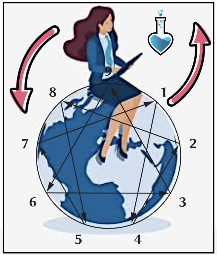EXP : Type 8 (arrows to #2 & #5) works hard to keep things running & to champion the underdog – everywhere. The qualities from type 2 can be used to soften the 8’s ‘natural’ harshness when interacting with others . And the 5’s studious nature can be used to quiet the 8’s busyness so it can take private time to contemplate or study.