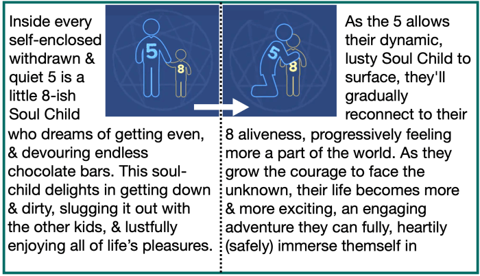 ♥️ The Soul Child theory uses the standard Enneagram teaching about the arrows going out from or toward our core Type, which is about taking on characteristics of the higher side of one number when we’re healthy, & the lower side of another number when stressed.