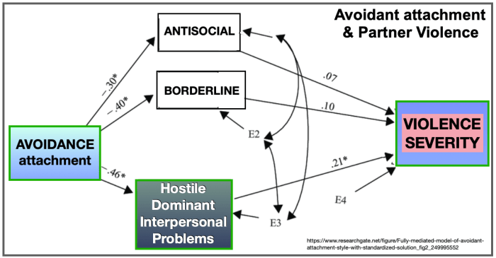 They conducted a two path analysis, with Avoidant and Anxious attachment styles as predictors……. Both hypotheses were supported, but the Avoidant model provided the stronger evidence……. It showed that abusive partner men with predominantly avoidant attachment are most like to deal with domestic conflicts (HDIP) in coercive, controlling, & vengeful ways, using physical aggression toward a partner……