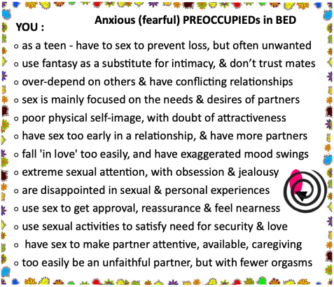 Red flag : when sex becomes necessary to fix emotional issues – our old abandonment trauma. Sexual behavior of Preoccupieds is driven by trying to make up for the a deep lack of love & security – rather than from a place of empowerment.