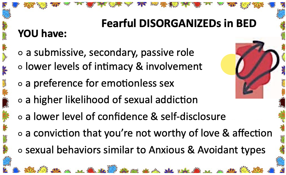 Disorganized people tend to swing between anxiety- & avoidance-driven behaviors, creating generally unstable & unpredictable social interactions. This tendency can also apply to their sex life.