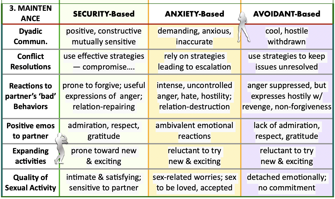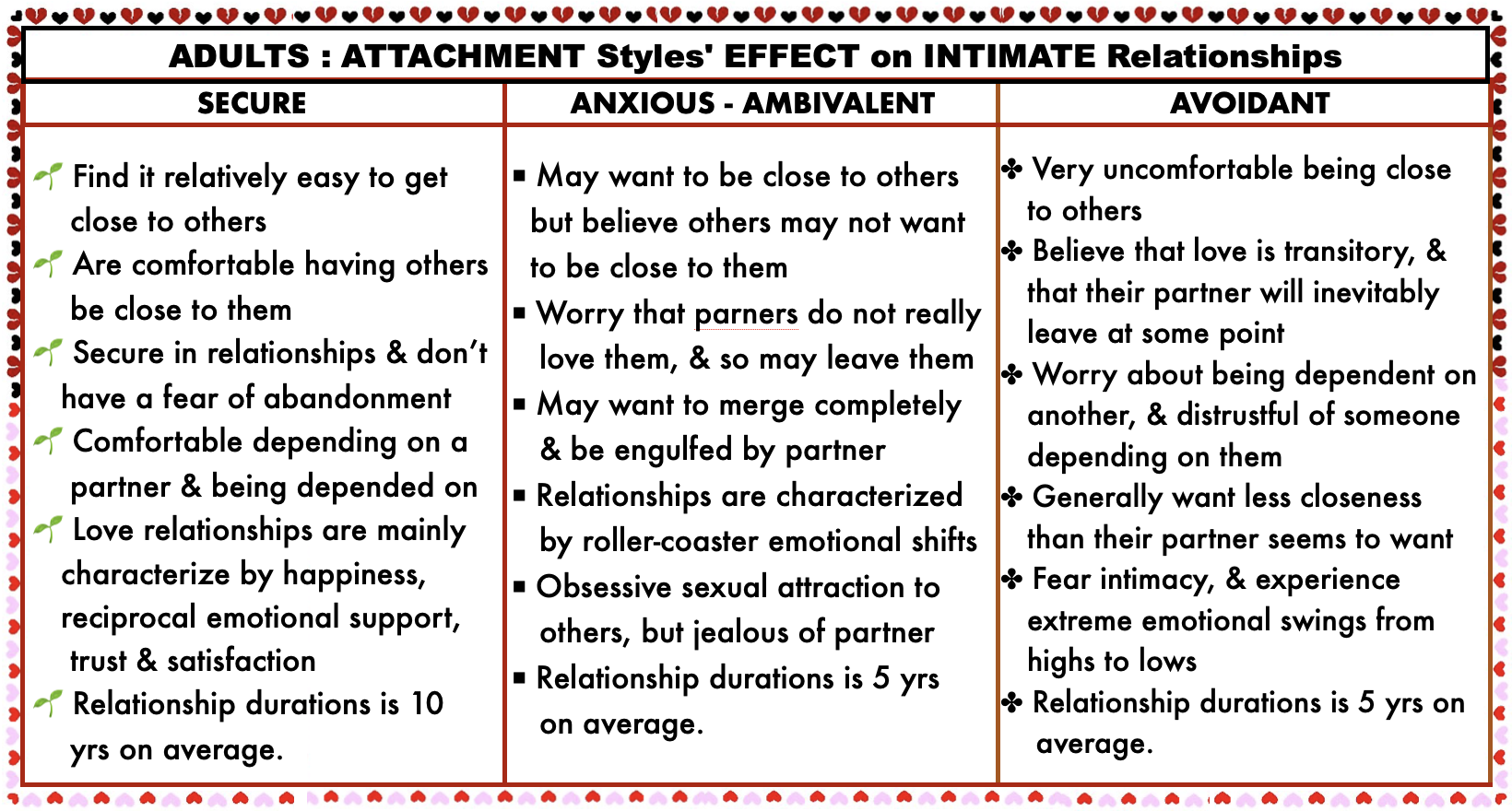 Cross-cultural studies suggest that mothers everywhere considered childhood Secure attachment the most desirable pattern. Adults looking for long-term relationships consider potential partners as most attractive who have ‘responsive caregiving qualities’ such as warmth, attentiveness & sensitivity. However, not all adults are paired with such partners. Research suggests that people end up in relationships with someone who confirm their existing beliefs about love relationships.