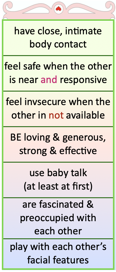 It’s the emotional bond that develops partly as the result of how well it copies the same set of interactions the partners had with their parents – between infant & earliest caregiver – which becomes the relationship between adult love-partners. The mother-child connection & what lovers share have the same features. THEY : ↗️