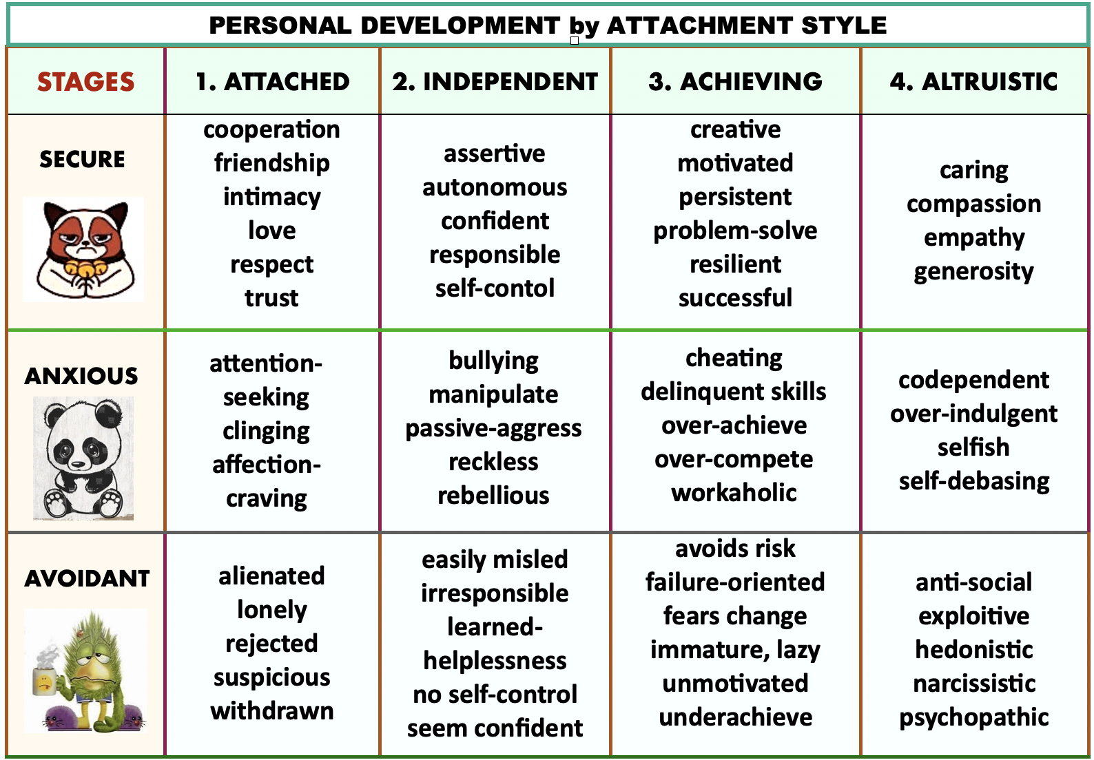 — whether an adult has a Secure or Insecure bond with a mate, it will at least partially be a reflection of all the experiences with their primary caregivers, since they tend to ‘work’ the way infant-mother relationship worked originally.