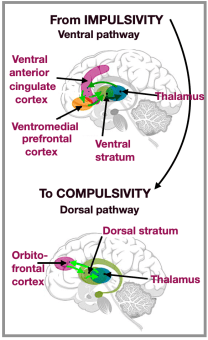 With any chronic substance abuse, there’s a ventral-to-dorsal shift (I to C), as the person’s drive moves from pleasure-seeking to needing relief from the painful symptoms of withdrawal & obsession to get more of the ‘drug / food’. This shift help maintained the disorder. (MORE…. ⬆️ & ⬇️)