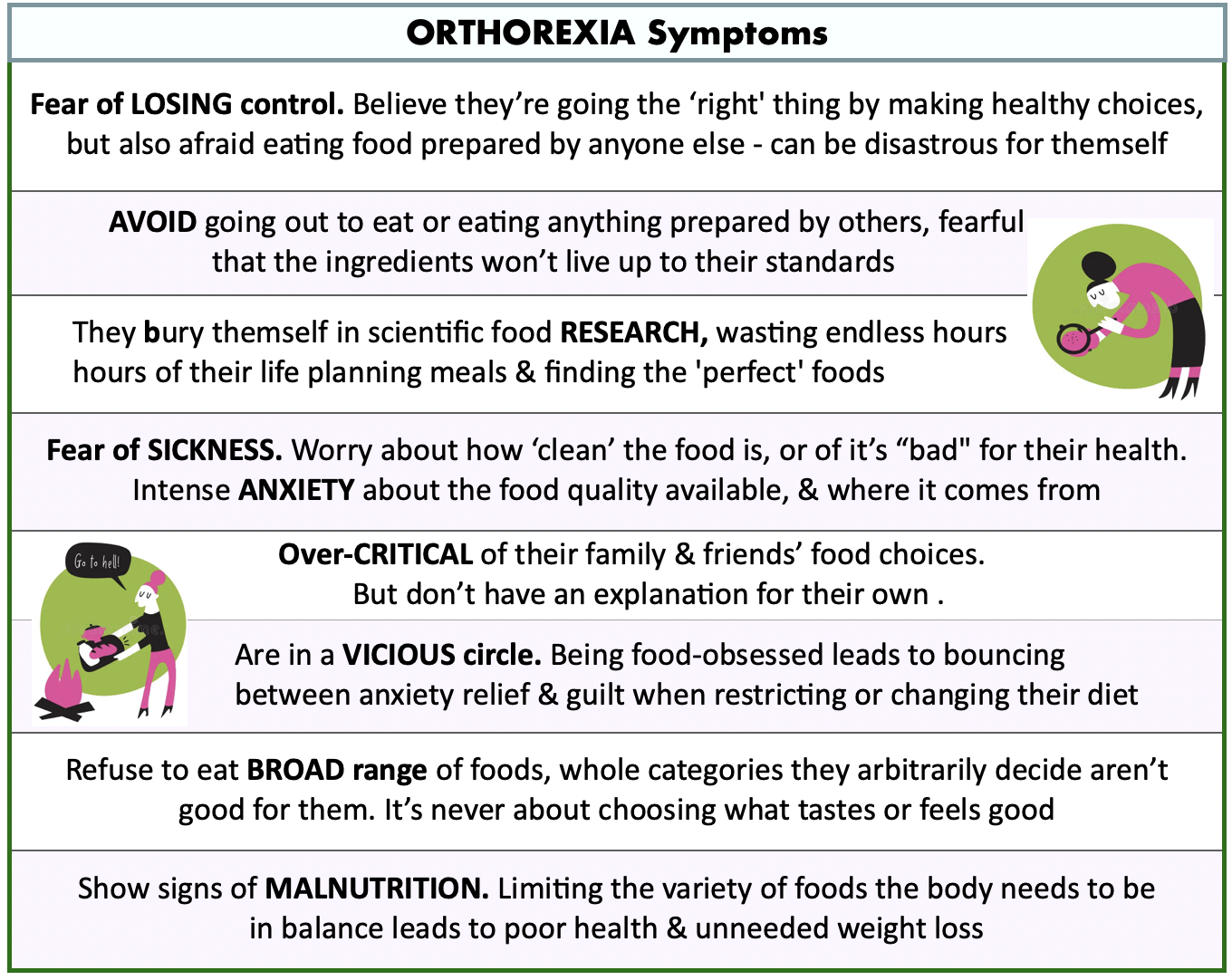 A “fixation on righteous eating”, the unhealthy focus on trying to eat healthily. This person will lose weight although not trying to. Breaking the rules they set for themself creates fear of disease along with anxiety & shame for their choices, so the rules get harsher over time. The person may also do unnecessary cleanses.