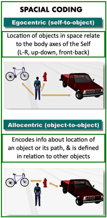 It’s gathered from reference points based on one’s location at the moment. It relies on remembering & recognizing objects that are or were around us which progressively forms a mental image about a place or location. From the ventral premotor cortex.  (Allo = Different, Other)