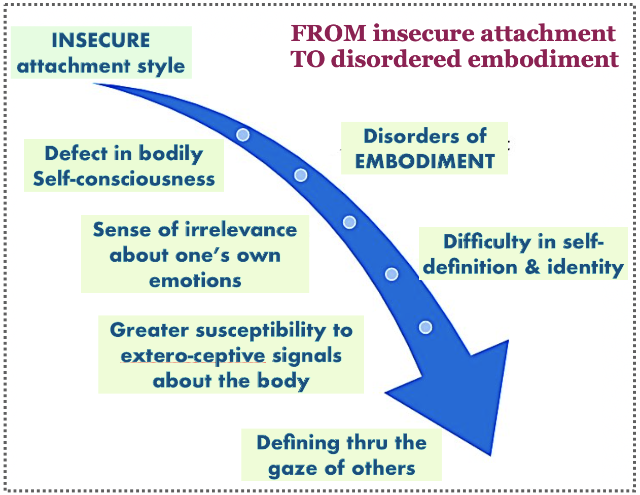 In patients with EDs, the self-reported insecure attachment style may be responsible for abnormal bodily self-consciousness (like looking in a fun-house mirror) or disordered embodiment (missing an internal perspective), which in turn —-> reduces emotion recognition & the ability to feel & decipher bodily “signals” such as hunger, satiety, fatigue or emotional feelings.