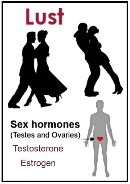 🟥 LUST (libido, sex drive) – needed to initiate the mating process with an appropriate partner. It’s a physical desire toward someone that does not have to include attraction, attachment, or deeper feelings, but must be satisfied by the instant gratification of a sexual encounter. The poet W. H. Auden called the sex drive “an intolerable neural itch.,” a powerful instinctual need.