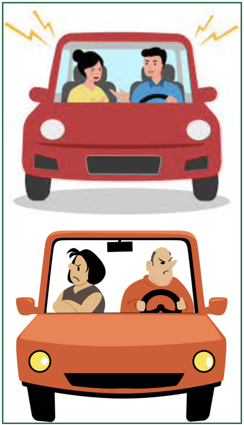 EXP : When going somewhere in a car, & she gets scared about how he’s diving, which makes him angry (More info).