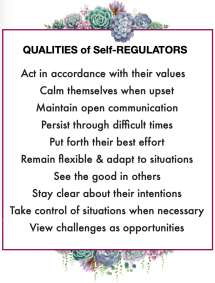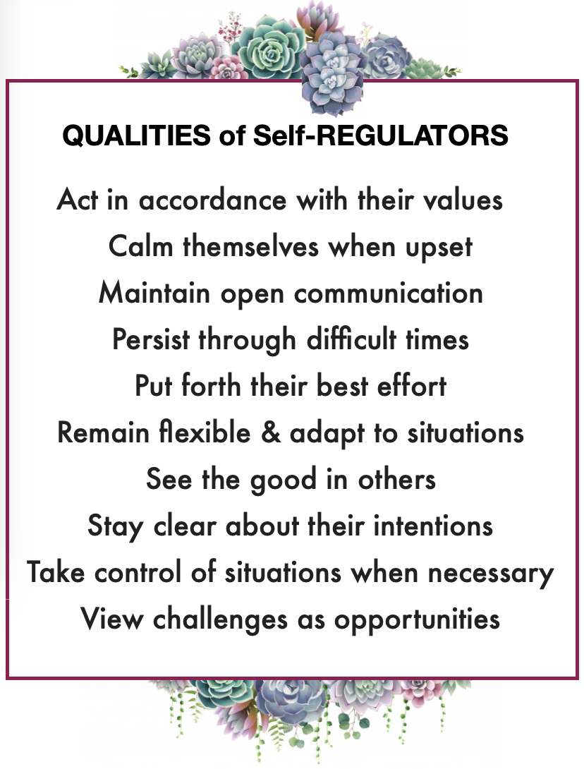 Being self-regulated helps us use the right personal & social skills – at the right time – resisting self-defeating or dangerous responses to internal reactions & external aggravations. In its most basic form, being able to S-R allows us to :