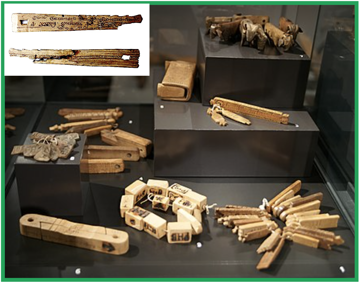INSET : Medieval English split tally stick (⬇️ front & back) – notched & inscribed to record a debt owed to the rural dean of Preston Candover in Hampshire – of a tithe of 20d each on 32 sheep, amounting to a total sum of £2 13s. 4d (UK).