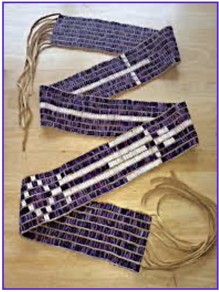 The earliest known use (1535) of wampum (short for wampumpeag = ‘white strings of shell beads’) – were made from clam & mollusk shells by North American Indians, but likely existed well before. These were used in ceremonies, as a record of an important agreement or treaty, as an object of tribute given by subject tribes, or for gift exchange. Its value derived from its ritualistic importance & the skill involved in making the objects.