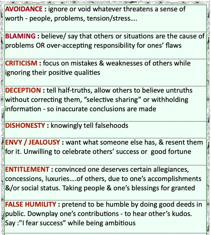 Character defects, als0 called negative traits or weaknesses, are long-standing patterns of thinking & behavior get in the way of personal growth & healthy relationships. ** They are not aspects of a person’s native personality, although influenced by inborn characteristics, twisted by long-term emotional & physical abuse & neglect.