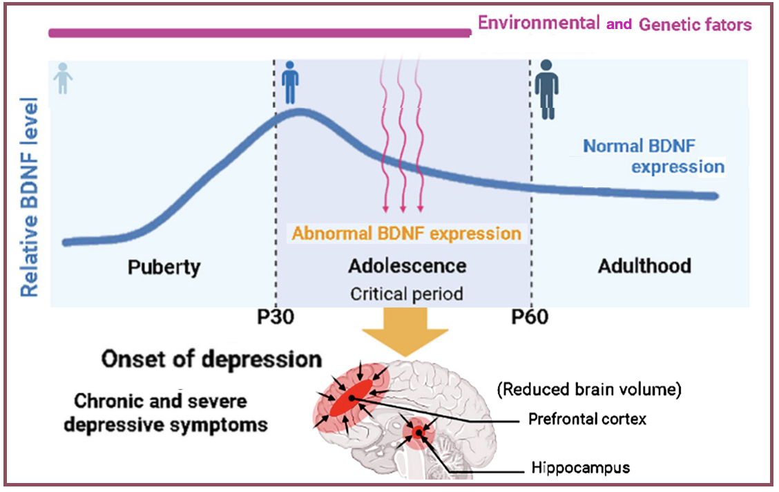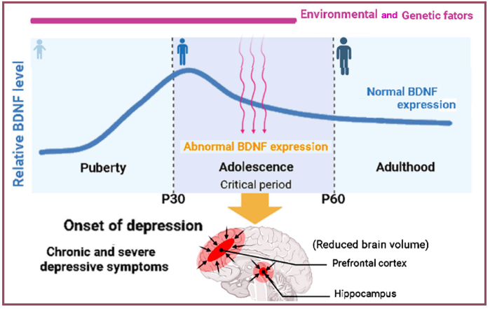 Abnormal BDNF expression due to genetic & environmental factors during adolescence may trigger onset of depression, leading to chronic & severe symptoms, with a risk of having a smaller prefrontal cortex & hippocampus, which can cause susceptibility to mood disorders.