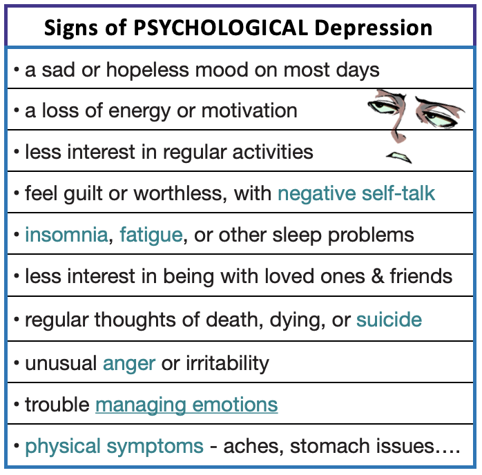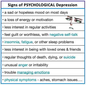 1. Psychological depression is a mood disorder that causes a persistent feeling of sadness & loss of interest – trouble doing normal day-to-day activities, & sometimes feeling that life isn’t worth living. But it’s not just a bout of the blues, not a weakness & one can’t simply “snap out” of it.