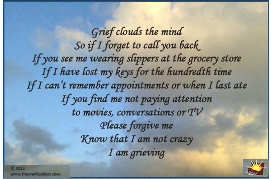 Personally & socially, grief can be very disorienting, since losses can causing trouble concentrating. Grief sucks up much of our energy, causing trouble concentrating. Something feels a little “off” physically. Being distracted & fatigued affects coordination, depth perception, & sense of personal space.