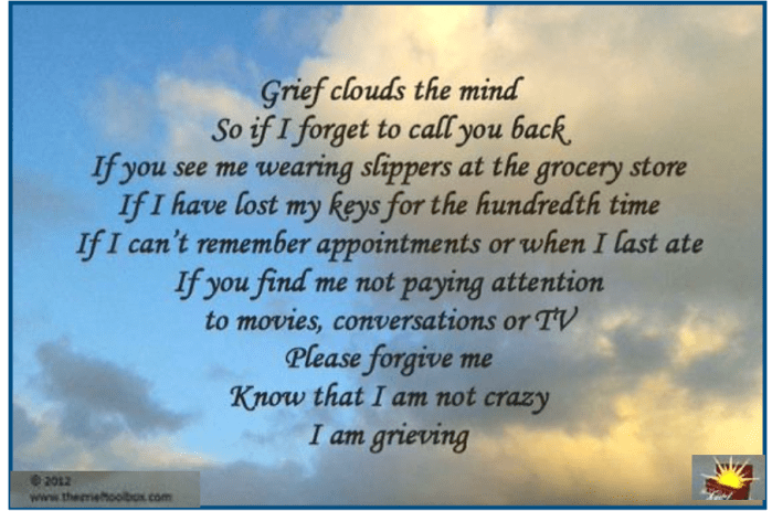 In the same vein as “Dizziness”, grief can cause memory loss, particularly short-term. Many people report feeling disoriented, forgetful, or mentally “foggy” in the days, weeks, or even months following a loss. The body floods with cortisol & other stress hormones, which can impair the hippocampus, an area involved in memory & learning. See article Grief and Concentration: 8 Tips for Coping With an Inability to Focus